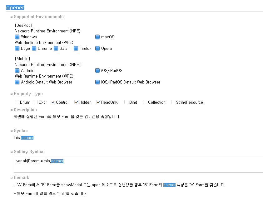 A Form에서 B Form을 showModal 또는 open 메소드로 실행했을 경우 B Form의 opener 속성은 A Form을 갖는다. => 이게 내 상황과 일치! 회사 코드가 showModal로 되어있어서 parent말고 opener을 써서 부모에 접근할 수 있었다.