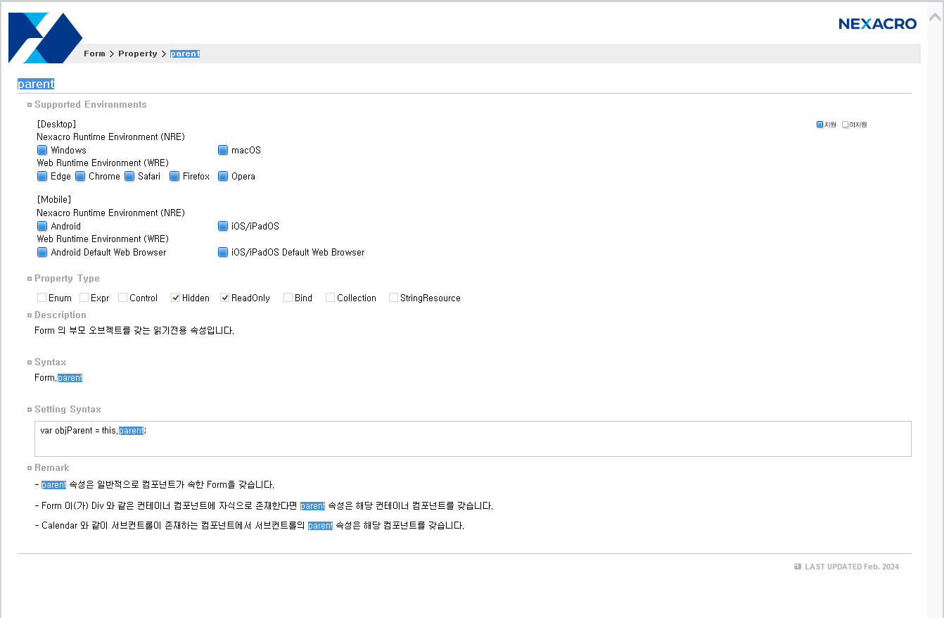 Form의 부모 오브젝트를 갖는 읽기 전용 속성