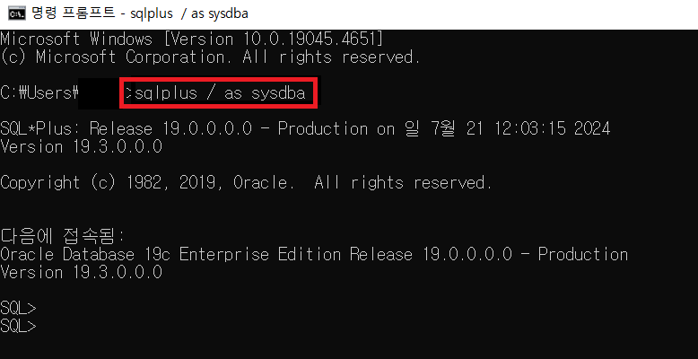 설치가 잘 됐는지 확인하기 위해 cmd창을 열어서 sqlplus / as sysdba를 입력한다.