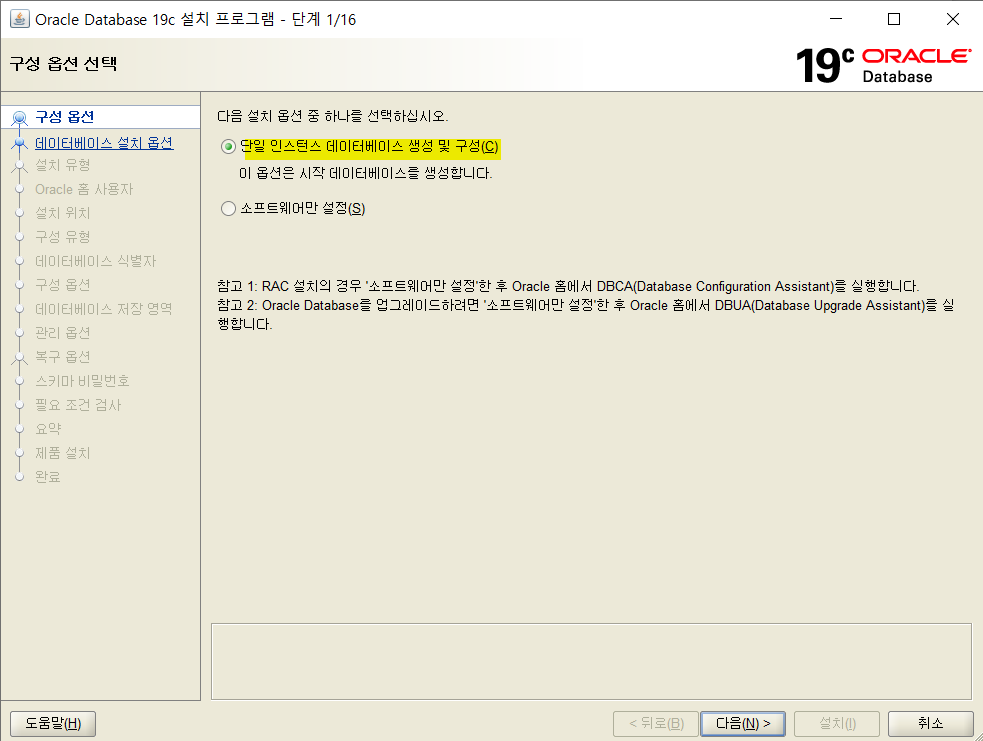 4. 단일 인스턴스 데이터베이스 생성 및 구성을 선택한다.